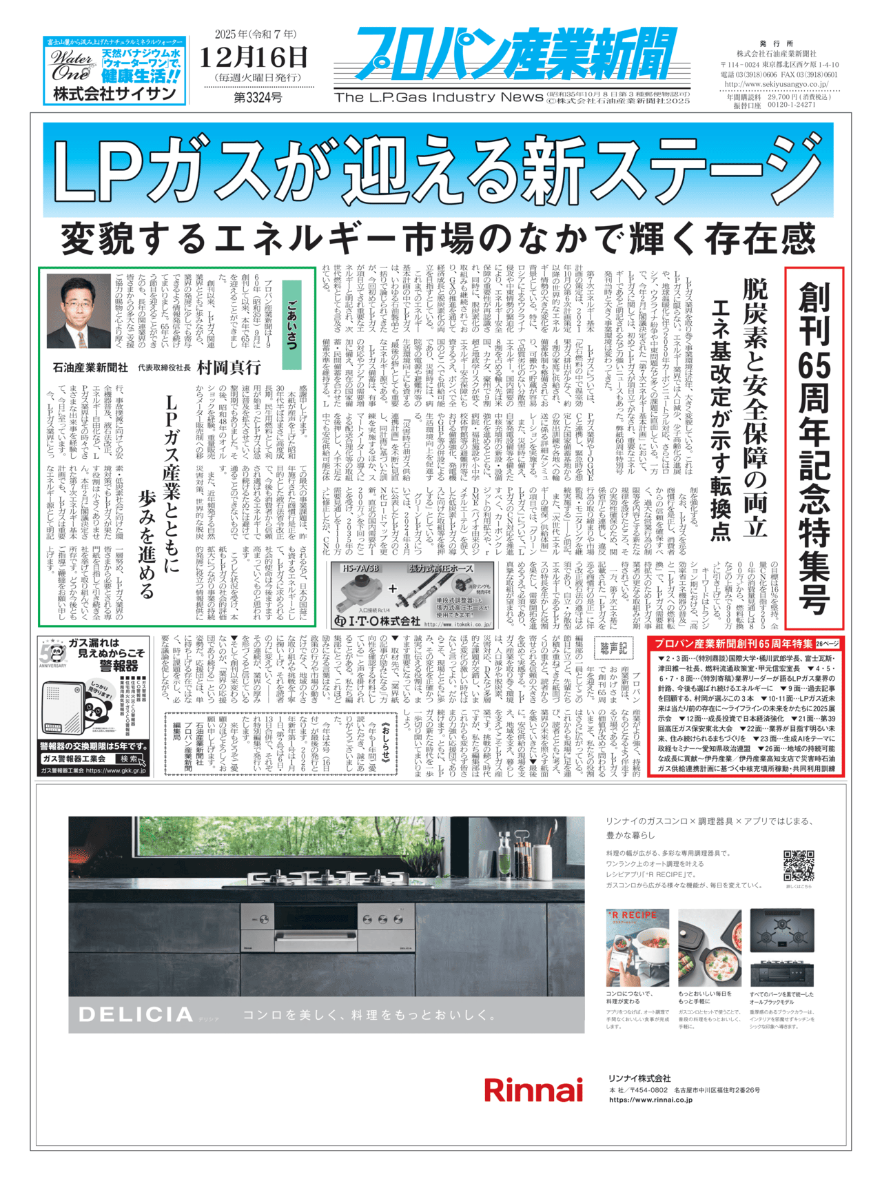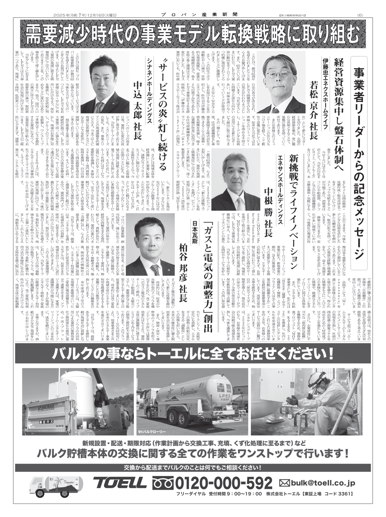 2025年12月16日(火)発刊のガス業界紙「プロパン産業新聞/創刊65周年記念特集号[第3324号]7面:業界リーダーメッセージ」に当社紹介(代表者メッセージ)及びサービス概要が掲載されました。