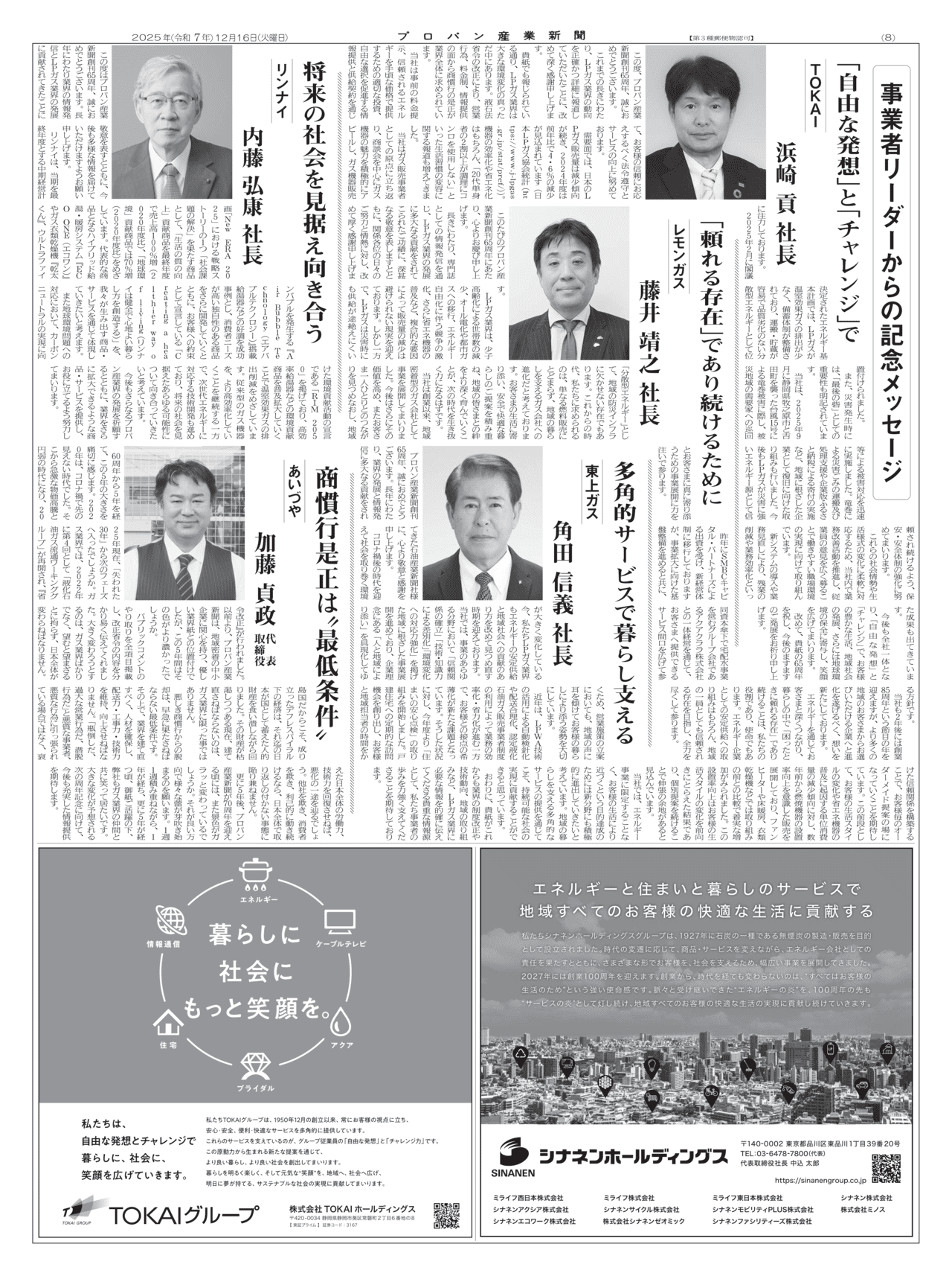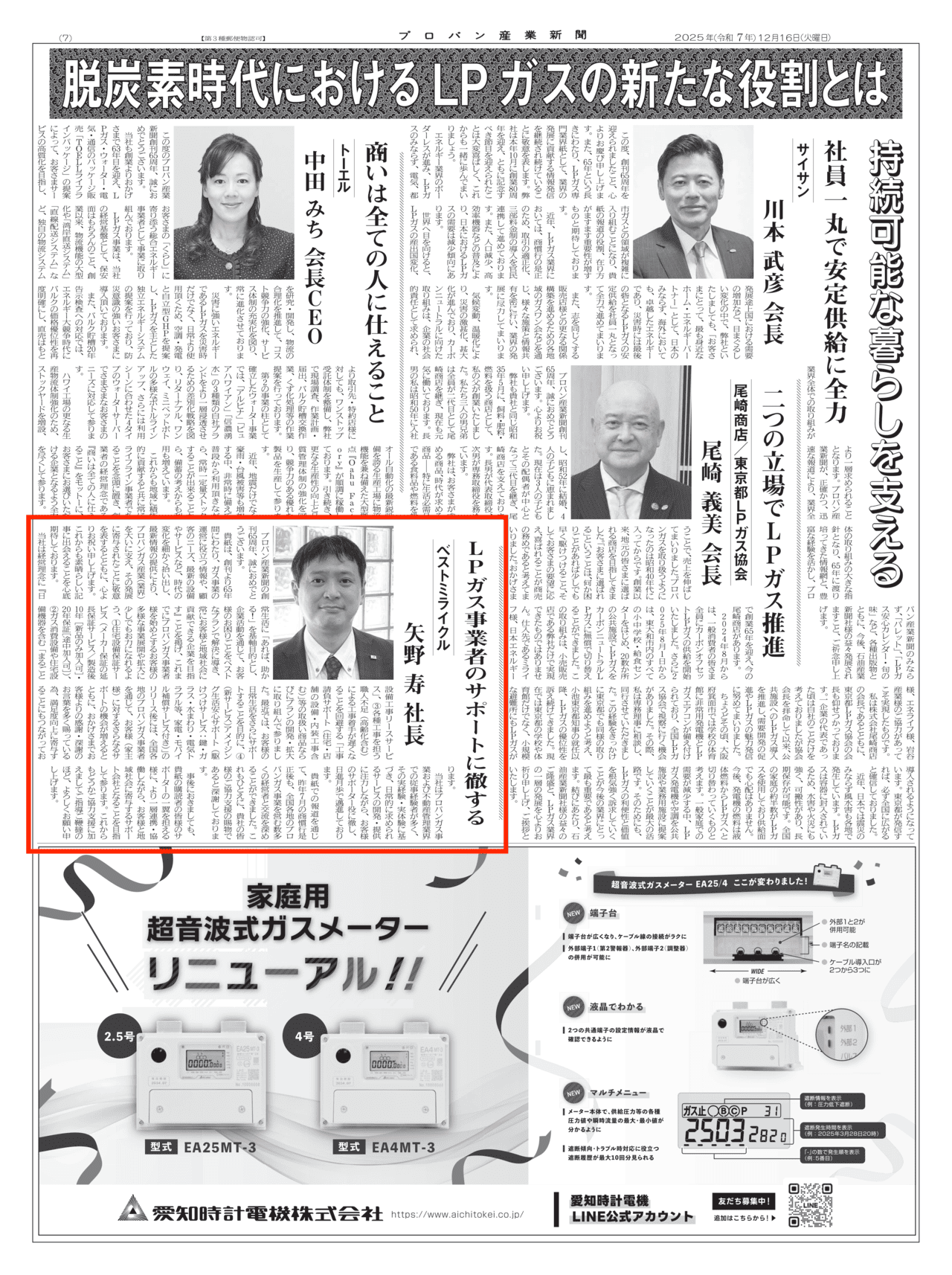 2025.12.162025年12月16日(火)発刊のガス業界紙「プロパン産業新聞/創刊65周年記念特集号[第3324号]7面:業界リーダーメッセージ」に当社紹介(代表者メッセージ)及びサービス概要が掲載されました。
