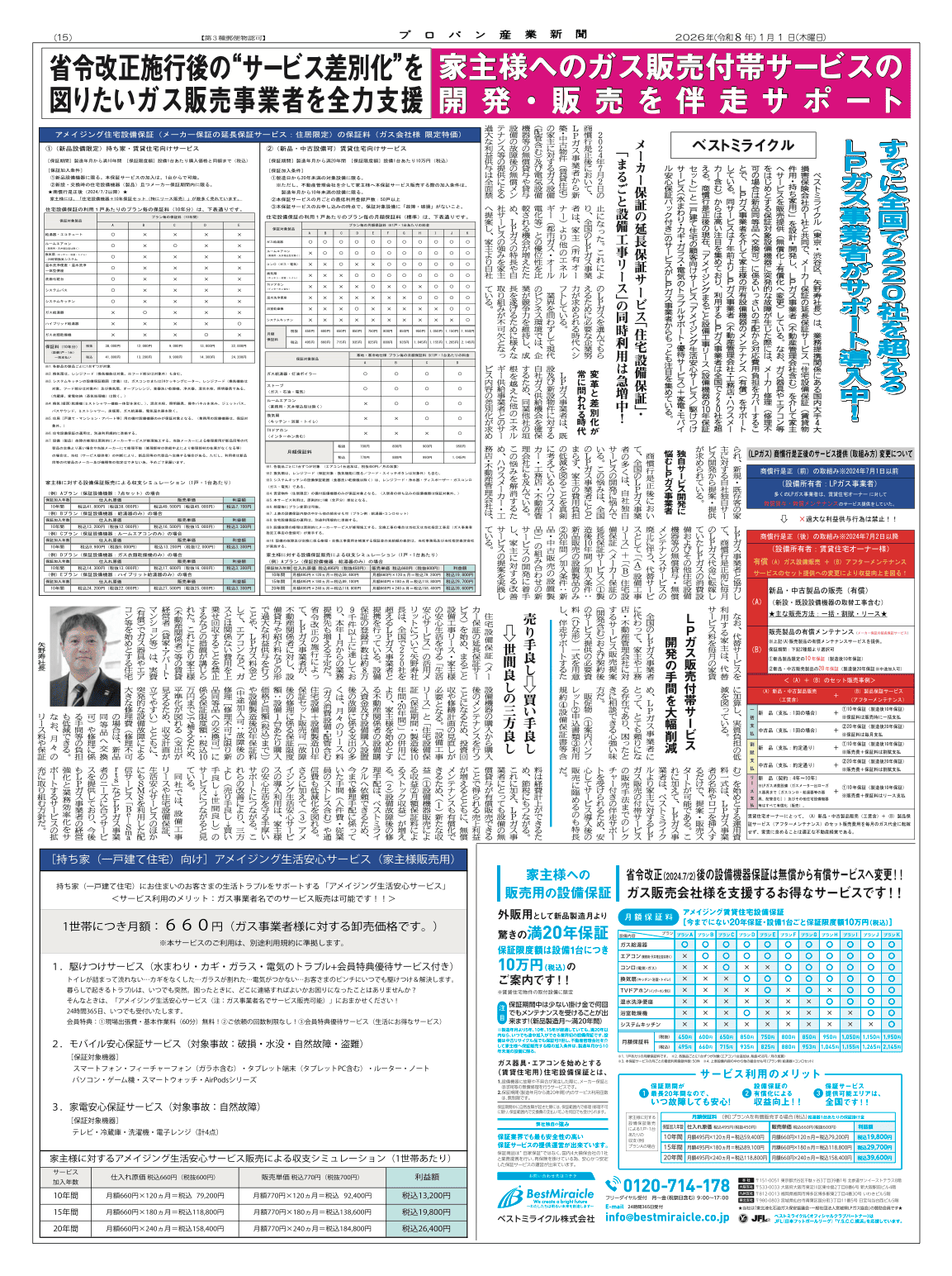 2026年1月1日(木)発刊のガス業界紙「プロパン産業新聞/2026年元旦号[第3325号]15面」 に当社「①アメイジング住宅設備保証(メーカー保証の延長保証サービス/10年・20年保証)及び 併用サービス:②アメイジングまるごと設備工事リース③アメイジング生活安心サービス/都市・LP ガス事業者→家主様への 販売用」のサービス概要が掲載されました。